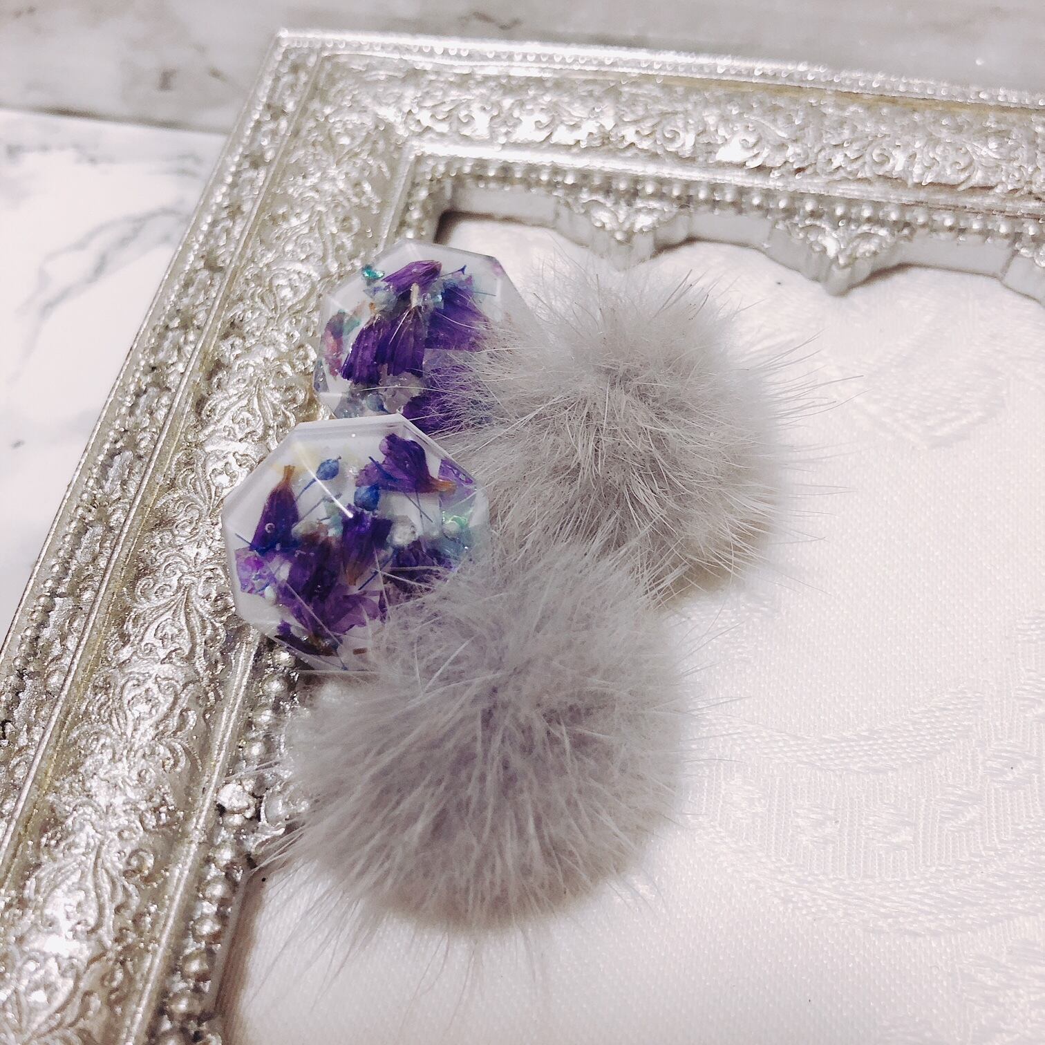 パープルのドライフラワーを閉じ込めて、グレーのミンクファーと組み合わせた、大人かわいいイヤリングです♪