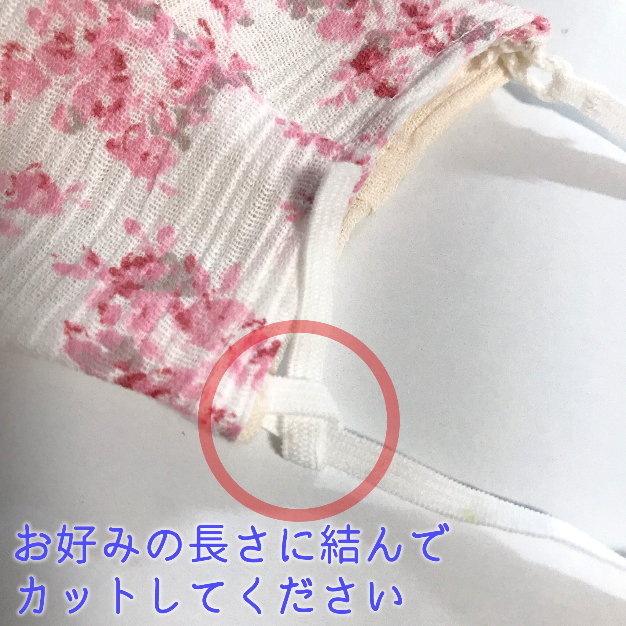 マスクゴムはマスク用のやわらかいゴムです。片方を結んでいない状態で発送しますので、お顔のサイズに合わせて調整してください(画像5枚目参照)。
