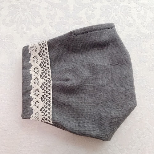 ダーツを入れる事でお口の周りに空間ができ、呼吸がしやすく、シルエットが美しくなるような形に仕上げました。メイクが落ちにくい立体タイプで、一般的な使い捨てマスクよりも大き目で横に長く耳元まですっぽり隠れるサイズです(着用イメージは一番最後の写真を参照くださいませ)。